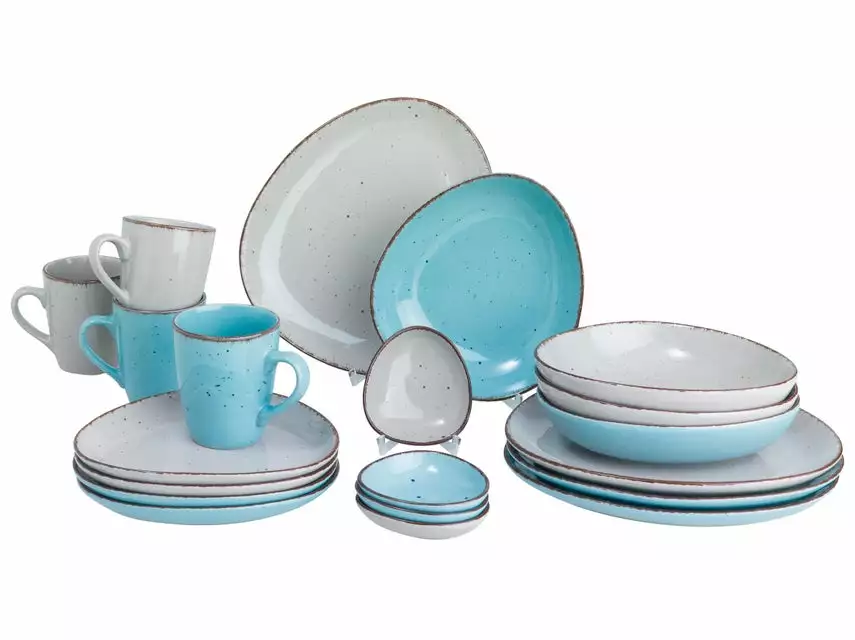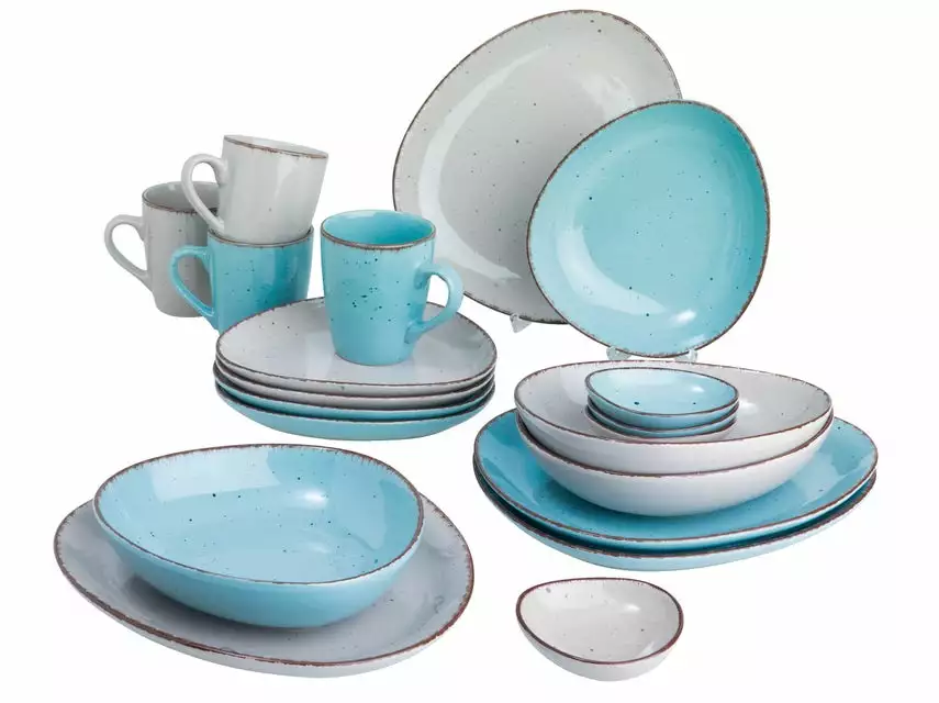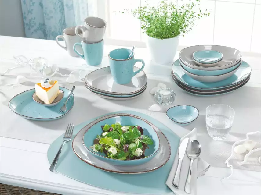 Natürliche Materialien sind wieder sehr angesagt. Dazu zählt Steinzeug, das mit seinem nostalgischen Charme, seiner beständigen Qualität und robusten Art ein Comeback feiert. Das 4-Personen-Service Nature Look punktet mit Vintage-Optik, italienischem Flair und Vielseitigkeit: Denn die ausgefallenen Dreiecksformen und sanft glänzenden Farben Türkis und Sand können Sie beliebig mischen. Dass Ihr gedeckter Tisch immer etwas einzigartig ist, dafür sorgt das von Hand gemalte Dekor. Es kann in Details variieren und macht jedes der 20 Stücke der Marke Arte Viva zum Unikat.