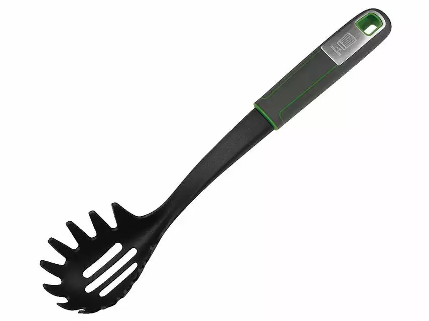 Der Spaghettilöffel von Chefkoch trifft Fackelmann ist der richtige Helfer, wenn es um das stilvolle Auftragen all der tollen Chefkoch Nudelkreationen geht. Nicht nur das großartige Design aus zeitlosem Grau mit grünen Akzenten bereichert die Küche. Auch die Funktionalität des Spahettilöffels erfreut ambitionierte Köche. Das Funktionsteil ist mit einer Gesamtlänge von ca. 30,5 cm dank dem attraktiven Soft-Touch-Griff mit Edelstahl-Einsatz gut zu führen. Die Zacken sorgen für problemloses Halten von Pasta & Co. Überschüssiges Wasser kann durch die integrierten Schlitze schnell und sauber ablaufen. Das hochwertige 3-H-Material des Chefkoch trifft Fackelmann Spaghettilöffels ist spülmaschinengeeignet und hitzefest bis +270 °C. Damit kann auch bedenkenlos in beschichteten Pfannen und Töpfen gearbeitet werden. Danach geht es ab in die Spülmaschine und schon ist der Spaghettilöffel bereit für seinen nächsten Einsatz. Die Verpackung aus FSC®-zertifiziertem Papier ist ein klares Statement für mehr Nachhaltigkeit.