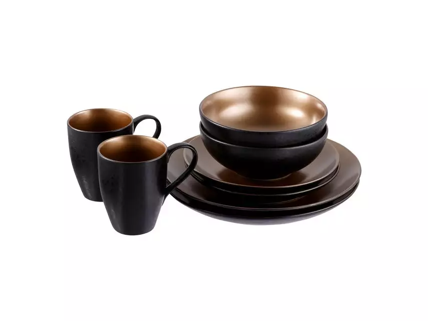 Das Service besteht aus 2 Speisetellern 27 cm Durchmesser, 2 Desserttellern mit 21 cm Durchmesser, 2 Schalen mit 16,5 cm Durchmesser und 2 Kaffeebechern (300 ml)