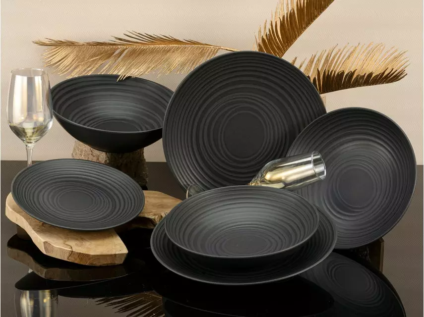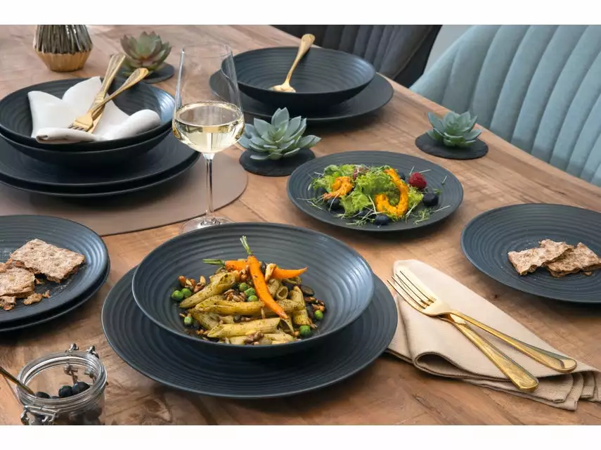 Black is back! Kein Wunder, denn dunkles Geschirr ist ungewöhnlich und trendig. Für das extravagante Service Lava Stone von CreaTable kann man nur sofort Feuer und Flamme sein. Inspiriert von Vulkangestein beeindruckt es mit einer Handmade-Optik: Wie graviert wirkt die plastische, schwarz-graue Rillenstruktur der Innenseiten, die schönen Unregelmäßigkeiten sind bewusst gesetzt. Echtem Stein nachempfunden ist auch die seidenmatte Glasur, die kratzfest und strapazierfähig bleibt. In Stil und Farbe ist das edle Teller-Set für vier Personen vor allem abends eine heiße Empfehlung.
