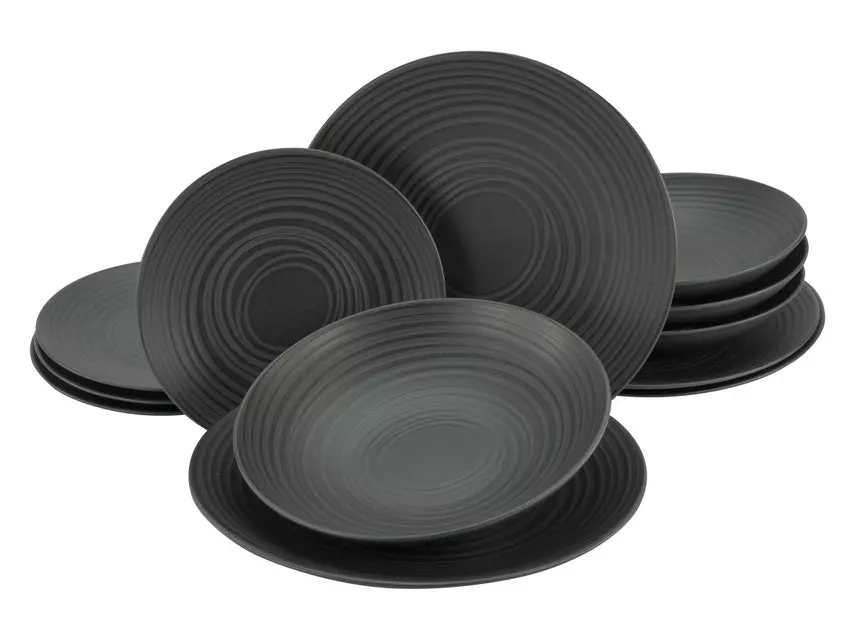 Das Set besteht aus 4 Speisetellern (D: 27 cm), 4 Pasta-/Salat-/Suppentellern (D: 22 cm) und 4 Desserttellern (D: 21 cm).
