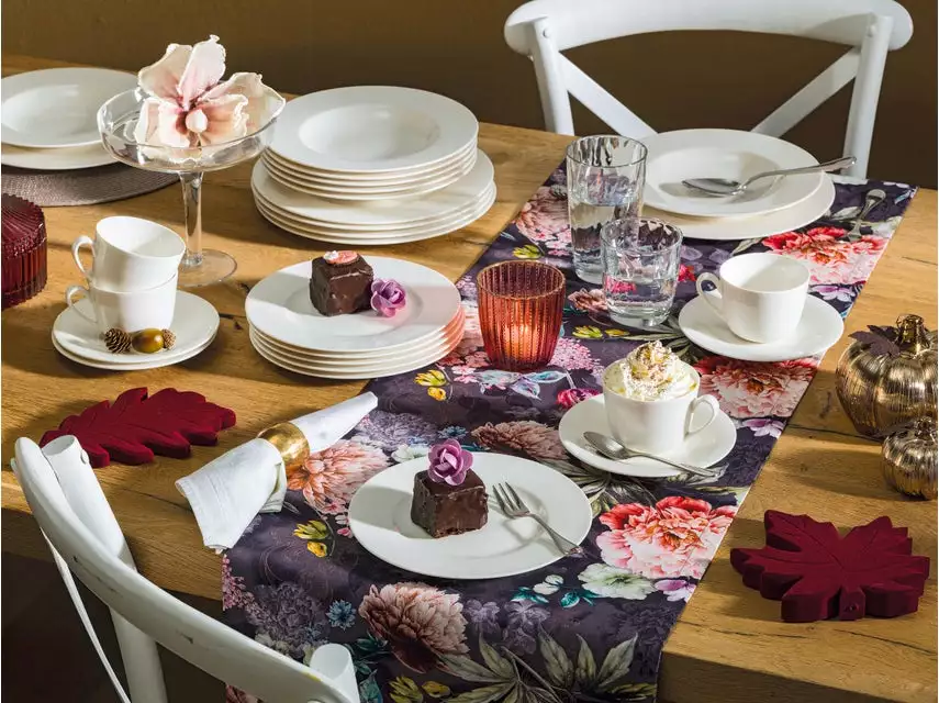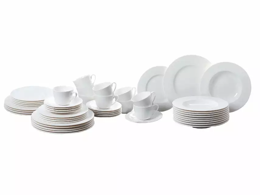 Das Service besteht aus 10 Speisetellern (D: 27 cm), 10 Suppentellern (D: 24 cm), 10 Frühstückstellern (D: 22 cm), 10 Kaffeetassen (200 ml) und 10 Untertassen (D: 10 cm).