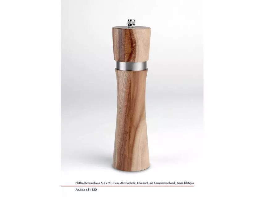 Echtes Akazienholz und elegante Edelstahl-Applikationen, damit macht diese exklusive Pfeffer-/Salzmühle auf jedem Tisch eine schicke Figur. Und dank des stabilen Keramikmahlwerkes ist sie nicht nur ausgesprochen attraktiv, sondern auch sehr stabil.