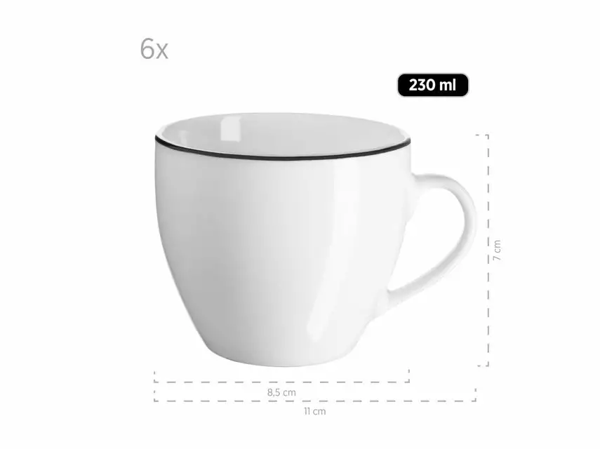 das stilvolle Kaffeeservice Enna ist das ideale Geschirrset für entspannte Kaffee- und Frühstücksrunden mit bis zu 6 Personen. Das praktische Set besteht aus 6 x Kaffeetassen, 6 x Untertassen und 6 x kleinen Tellern für Kuchen und Desserts. Das hochwertige Porzellan in klassischem Weiß hat einen dünnen schwarzen Rand, welcher dem Set einen edlen, optischen Akzent verpasst und sich perfekt in modern, aber auch in klassisch eingerichtete Wohnungen einfindet. Nach jeder Verwendung kann das Geschirr einfach von Hand oder in der Spülmaschine gereinigt werden und ist zudem zum Aufwärmen in der Mikrowelle geeignet. Das Service wird zum Versand in einen bruchsicheren Karton verpackt. Perfekt kombinierbar mit dem dazu passenden Tafelservice im gleichen Design. Bitte beachten Sie: Zur besseren objektiven Vergleichbarkeit gehen unsere Füllmengenangaben von einer randvollen Befüllung aus.