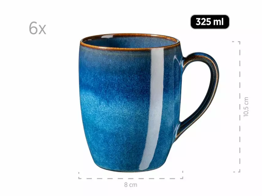 Dieses 18-teilige Frühstücksgeschirr Service aus hochwertigem Steinzeug besteht aus 6x Dessertteller (Ø 21 cm), 6x großzügige Müslischale (Ø 16 cm, 800 ml) und 6x Kaffeebecher (325 ml).