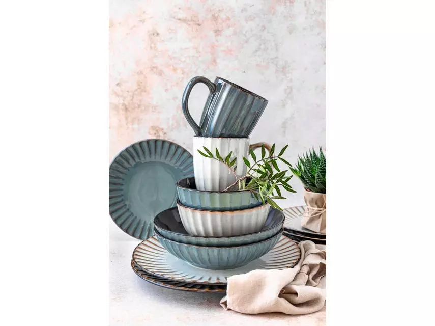 Die aufregende Kombination aus runden Retro-Formen mit Wellenrelief einerseits und einer modernen, unregelmäßigen Glasurtechnik mit schwarzen Akzenten andererseits verleiht der Tafelgeschirr-Kollektion Confino eine ganz besondere Eleganz. Die Keramikgeschirr-Serie der österreichischen Traditionsmarke Mäser wird aus hochwertigem Steinzeug gefertigt, welches nicht mit dem deutlich brüchigeren Steingut zu verwechseln ist. Die natürlich wirkenden Farbvarianten dieser Kollektion lassen sich harmonisch miteinander kombinieren. Dieses Set wird in einer vielfach auf Bruchsicherheit getesteten Paketversandverpackung aus nachhaltigen Materialien versendet. Bitte beachten Sie: Diese Kollektion wird händisch bunt lasiert, wodurch minimale Unebenheiten der Glasur, kleine Einschlüsse und leichte Farbabweichungen auftreten können. Zur besseren objektiven Vergleichbarkeit gehen unsere Füllmengenangaben von einer randvollen Befüllung aus.