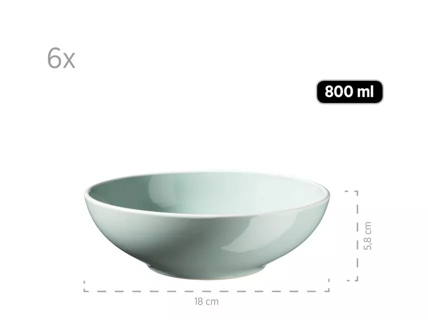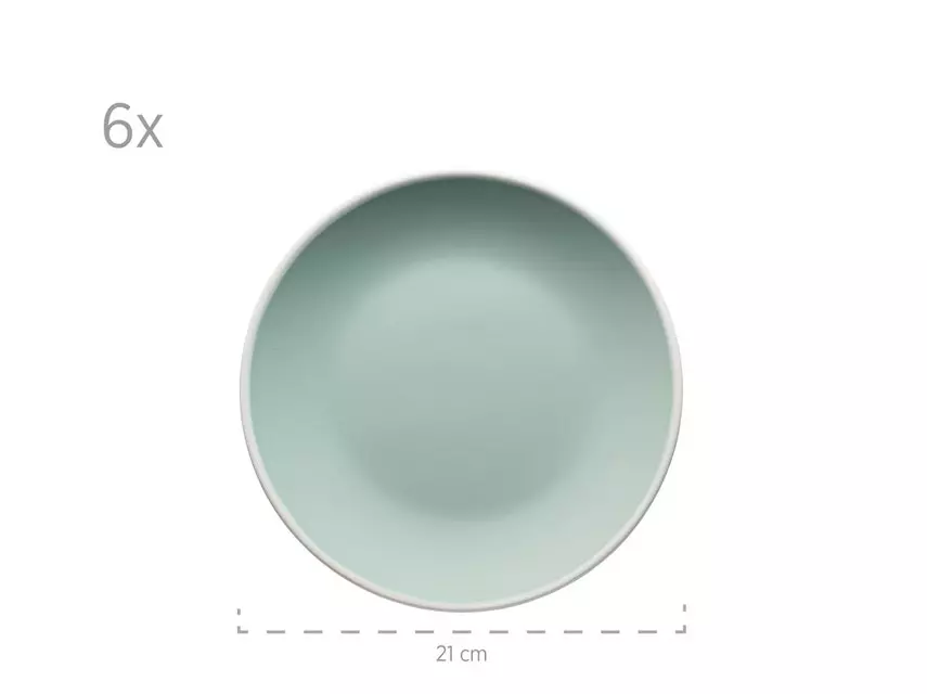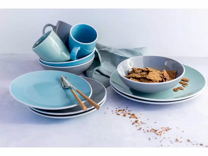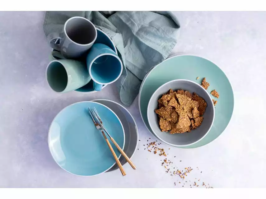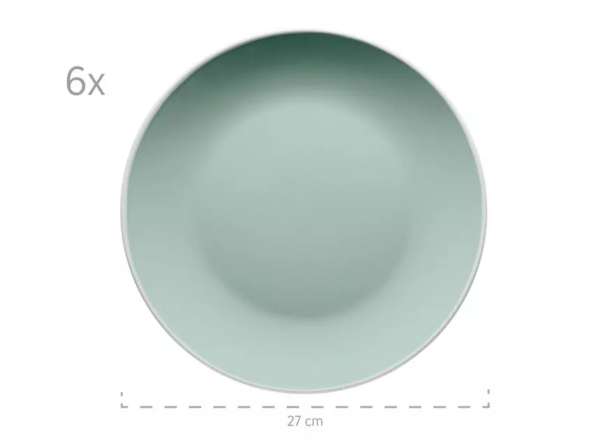 Dieses moderne und freundliche Geschirrset für 6 Personen umfasst 6 flache Speiseteller (Ø 27 cm), 6 Dessertteller (Ø 21 cm), 6 großzügige Müslischalen bzw. Suppenschalen (Ø 18,5 cm, 800 ml Füllmenge) und 6 Kaffeebecher (380 ml)