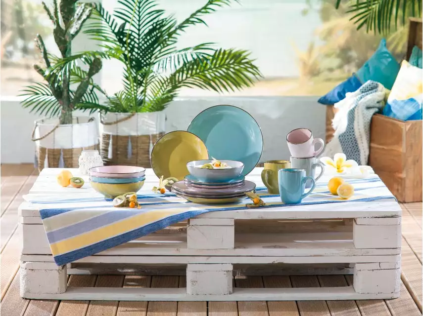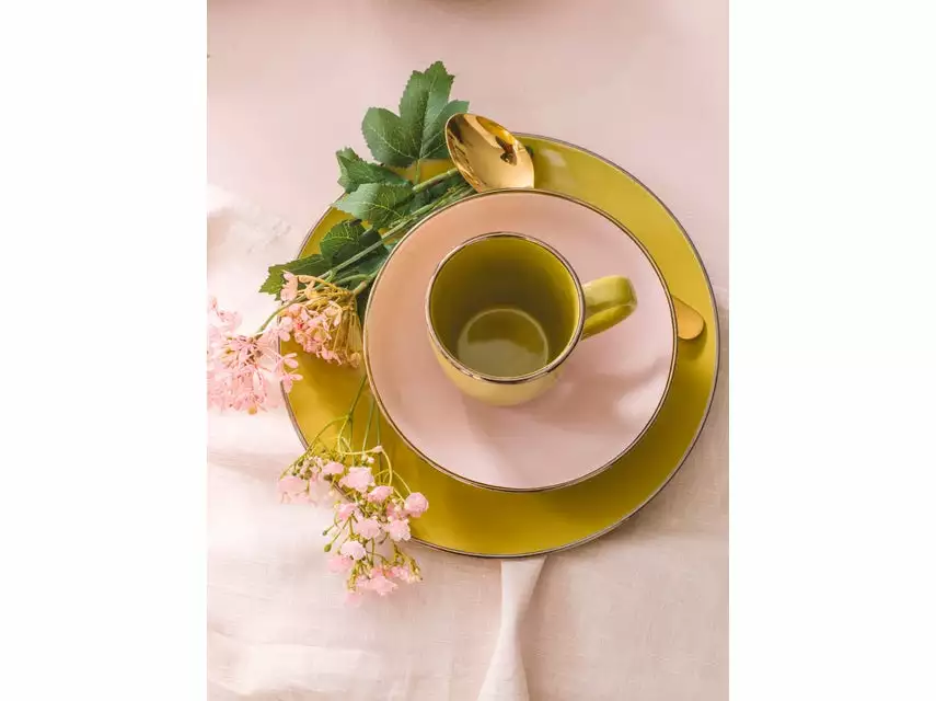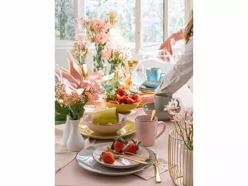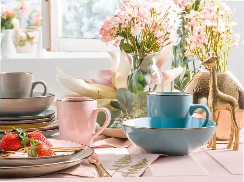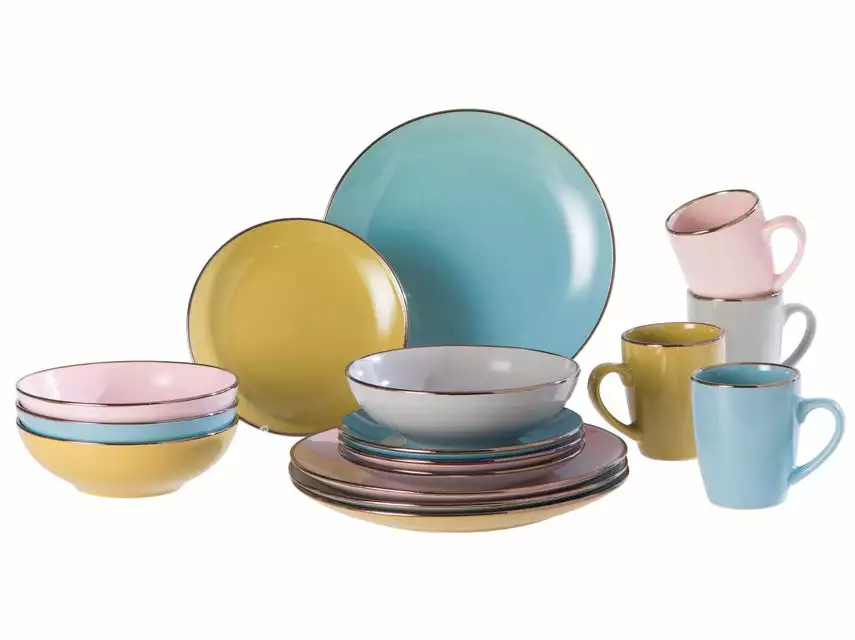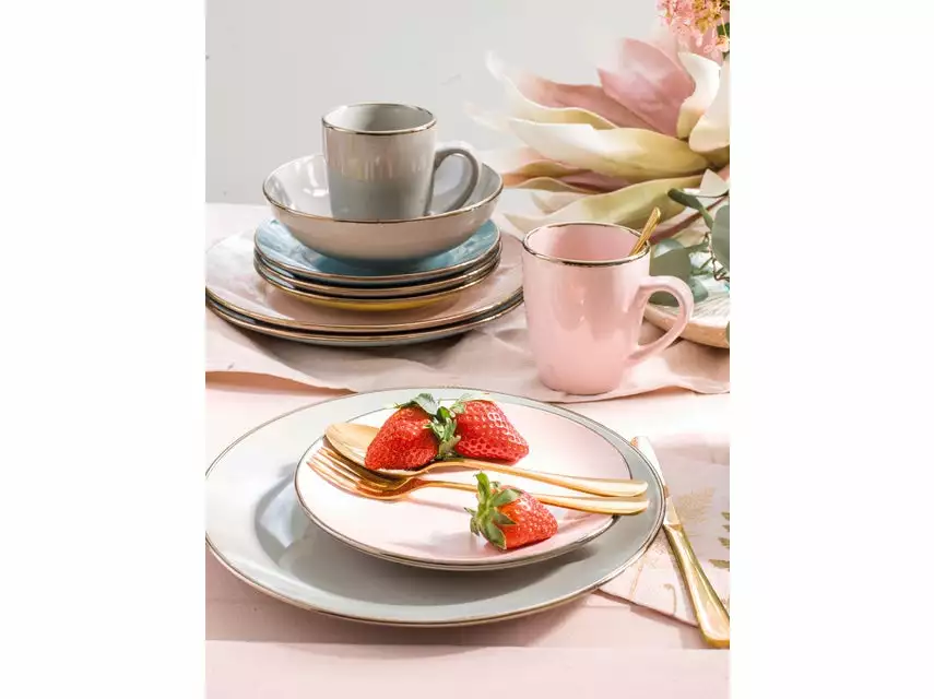 Ein Klassiker im Remix: Das traditionelle Goldrand-Dekor wird beim Kombiservice Metallic Rim neu und spannend interpretiert. Ein metallisch schimmernder Ring veredelt die 16 bunten Keramikteile und verleiht ihnen ein modernes Finish. Köstliche, aufeinander abgestimmte Sorbetfarben wie Rosa, Gelb, Hellblau und Zartgrau sind der perfekte Rahmen für Ihre Menüs und machen sie zum Augenschmaus. Für heitere Stimmung sorgen nicht nur die Farben, sondern auch das Material, das einiges aushält, so etwa die Reinigung im Geschirrspüler.