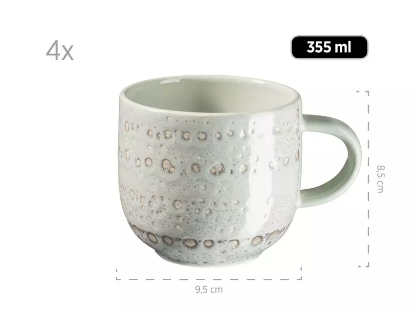 Dieses absolut außergewöhnliche 16-teilige Geschirrset enthält 4 flache Essteller (Ø 27 cm), 4 Dessertteller (Ø 21 cm), 4 Mehrzweckschalen (Ø 13,5 cm, 500 ml) und 4 Kaffeebecher (350 ml)