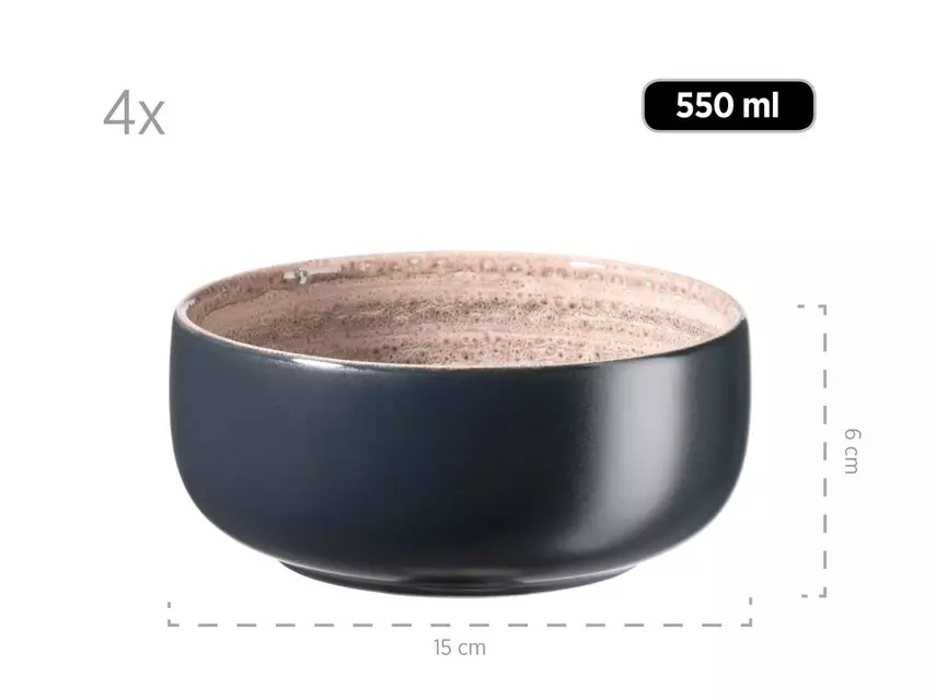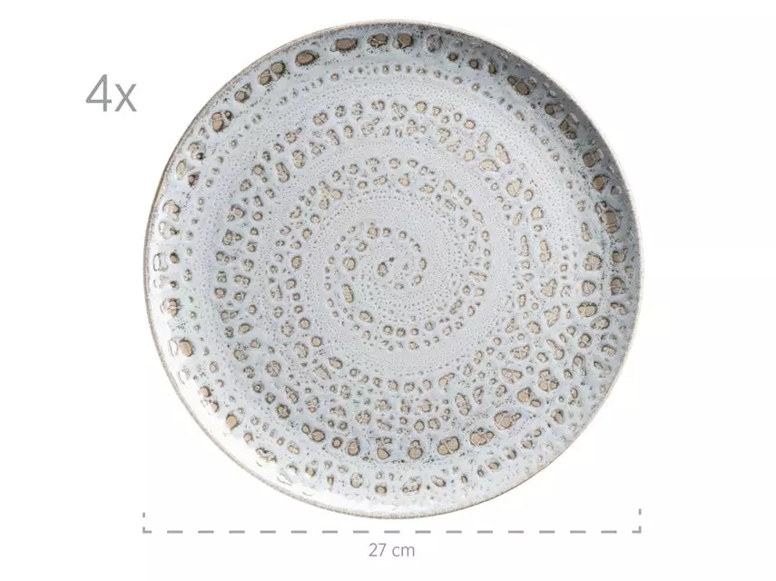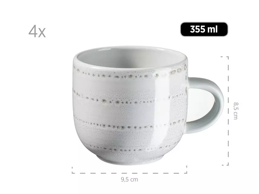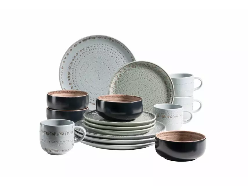 Dieses absolut außergewöhnliche 16-teilige Geschirrset enthält 4 flache Essteller (Ø 27 cm), 4 Dessertteller (Ø 21 cm), 4 Mehrzweckschalen (Ø 13,5 cm, 500 ml) und 4 Kaffeebecher (350 ml)