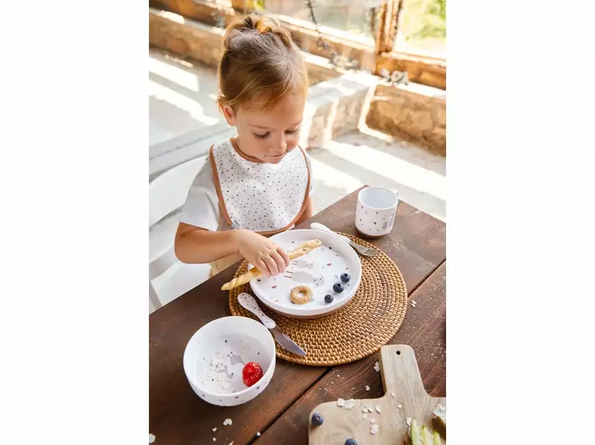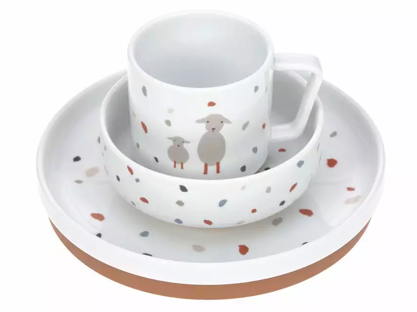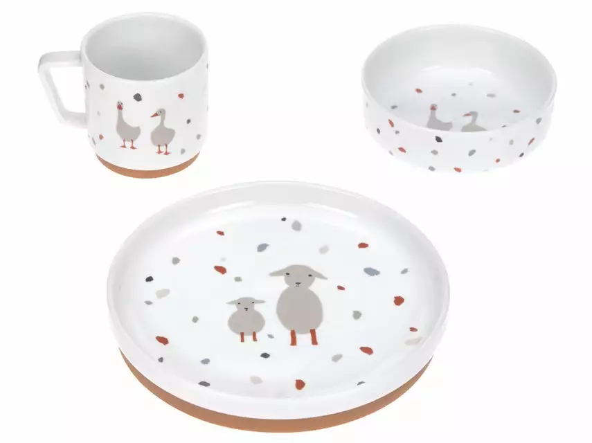 Das Kindergeschirrset besteht aus einem Teller, einer Schüssel und einer Tasse.