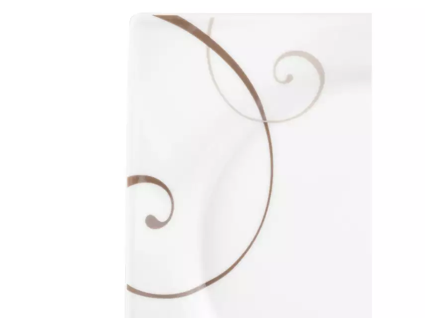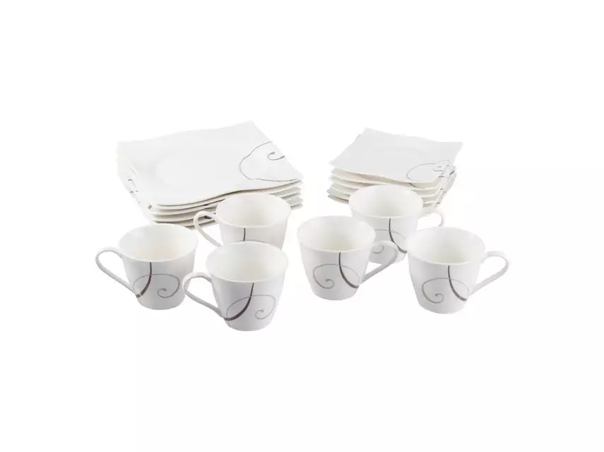 Das Service besteht aus 6 Tassen, 6 Untertassen und 6 Dessertellern mit 19 cm Durchmesser.