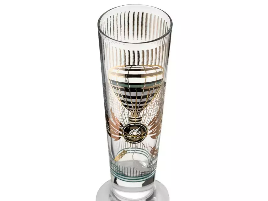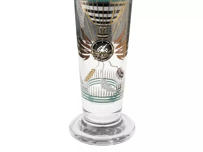 Designerin Petra Mohr 2016: Freiheit in Farbe übersetzt: Die Motive Traumfänger und Ballon als detailreiche Collage mit effektvollen Akzenten aus Edelmetall ‐ das Schnapsglas lässt ein Gefühl von Aufbruch entstehen.