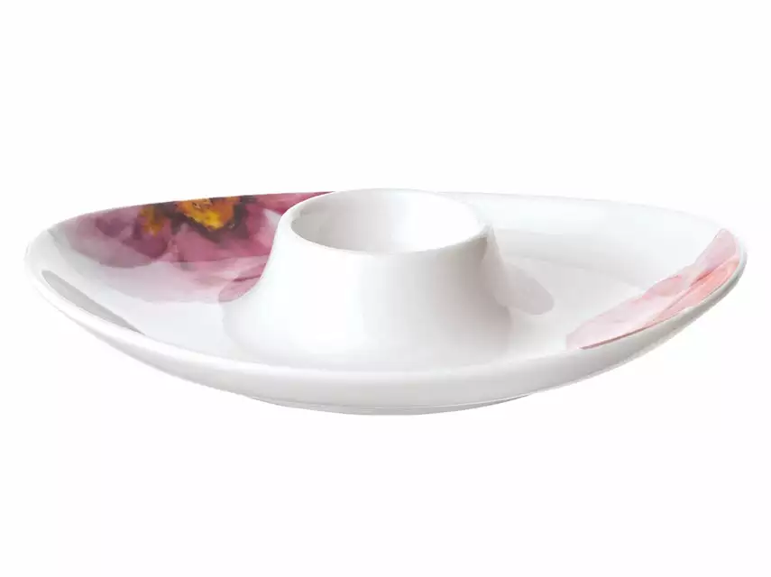 Ein Klassiker zum Frühstück ist und bleibt das weiche Ei. Damit auch dies stilvoll getragen wird, hat Villeroy und Boch einen schöngeformten Eierbecher im selbigen Rosendekor entworfen. Die ovale Form macht ihn besonders ansprechend und findet unter dem weiteren Frühstücksgeschirr gut Platz.