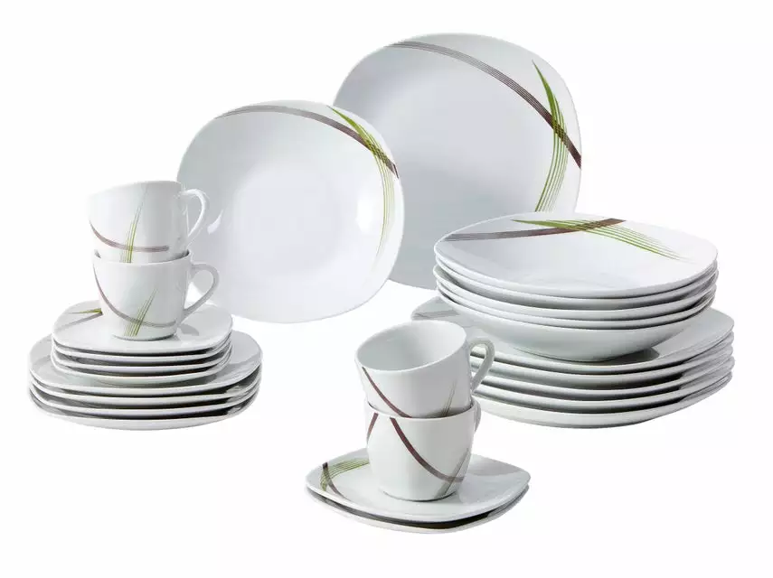 Das Service besteht aus 6 Speiseteilern (D: 24,7 cm), 6 Suppentellern (D: 21,6 cm), 6 Desserttellern (D: 19 cm), 6 Kaffeetassen und 6 Untertassen.