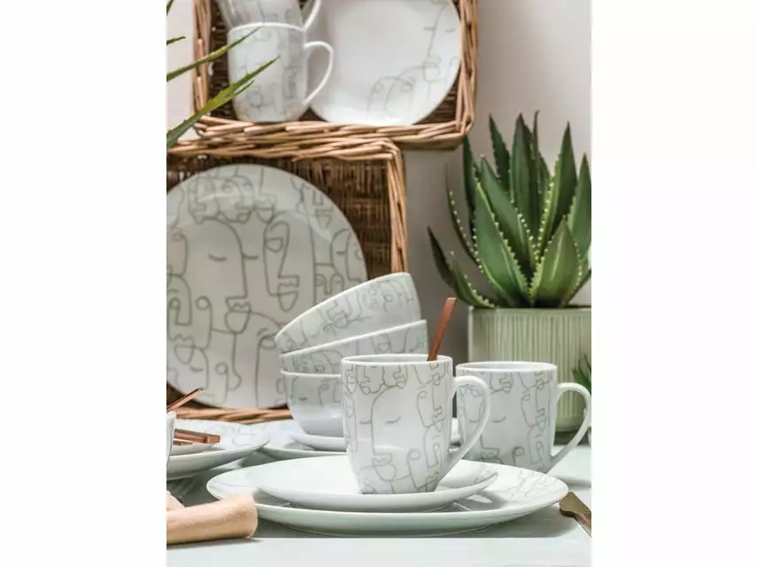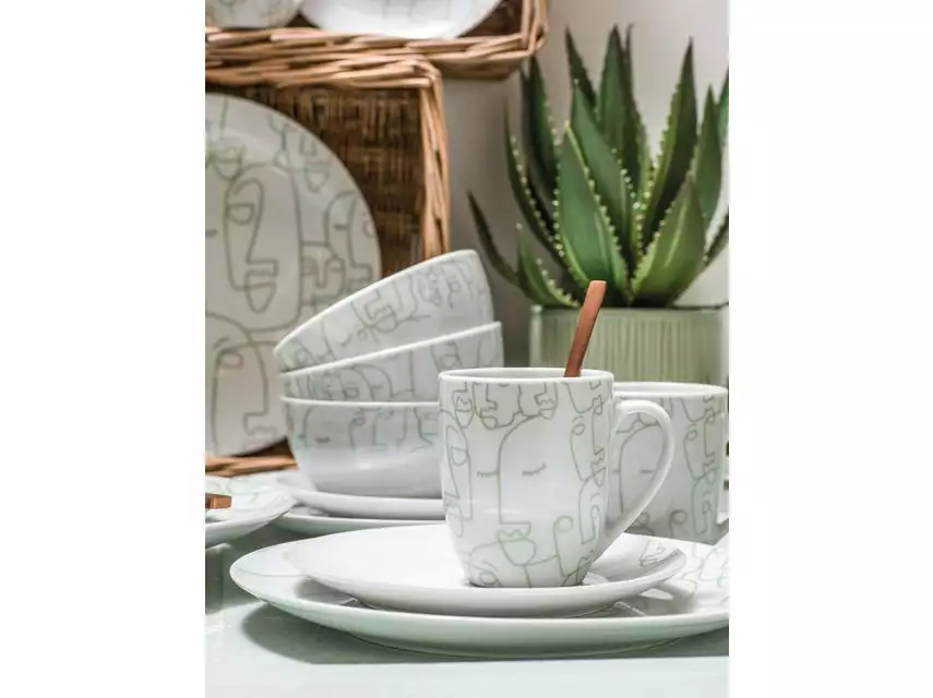 Sie sind auf der Suche nach einem neuen Geschirrset, welches nicht nur seinen Zweck erfüllt sonders zudem auch optisch überzeugt? Dann ist das Kombiservice Silhouette genau das richtige für Sie! Gefertigt aus hochwertigem Porzellan in Weiß und mit menschlichen Silhouetten in zartem Grün gestaltet, steht dieses 16-teilige Service für moderne Tischkultur am Puls der Zeit.