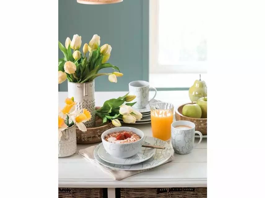 Das Service besteht aus 4 Speisetellern (D: 26,7 cm), 4 Desserttellern (D: 19 cm), 4 Müslischalen (D: 14 cm) und 4 Kaffeebechern (350 ml).