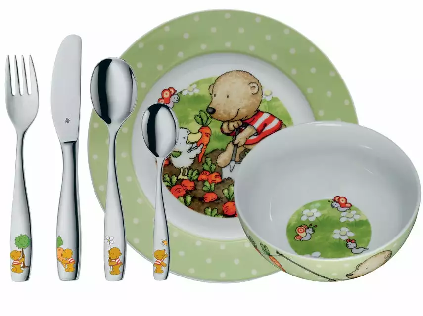 Das 6-teilige Set der Marke WMF mit Besteck und passendem Geschirr macht nicht nur Kindern Spaß. Die Motive schmücken den Tisch und machen das Essen lernen bunter! Das Set für Kinder ab 3 Jahren enthält neben einer Gabel und einem Messer auch einen Kinderlöffel, einen Kinderkaffeelöffel, eine Porzellanschale und einen Porzellanteller. So sind Sie und Ihr Kind für jede Mahlzeit perfekt ausgestattet. Für eine einfache Reinigung ist das Set auch spülmaschinenfest.